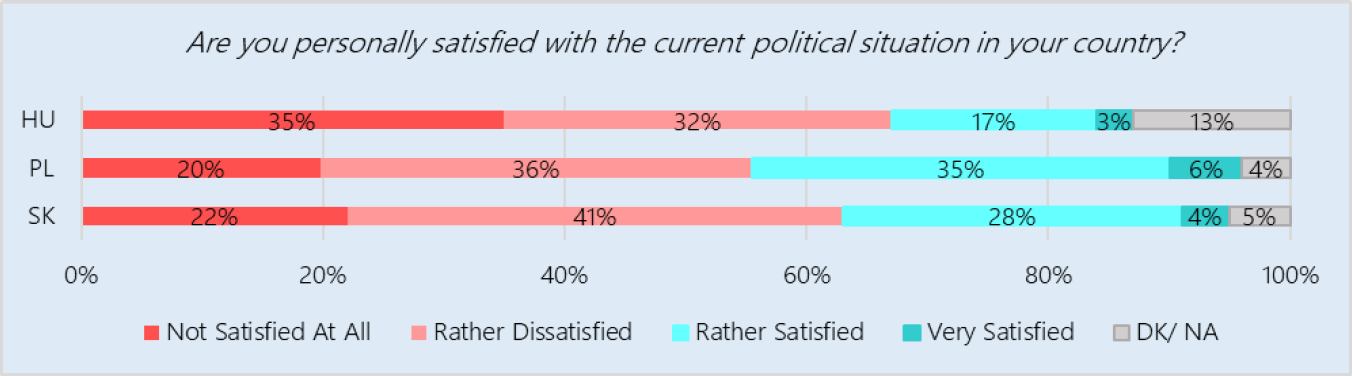 Ami a politikai helyzetet illeti, a fiatalok mindhárom országban, de leginkább Magyarországon kiábrándultak. Itthon a fiatalok 67%-a Szlovákiában 63%-a, míg Lengyelországban csak 56%-a elégedetlen. Az elégedett fiatalok aránya pedig rendre 20%, 32%, 41%.