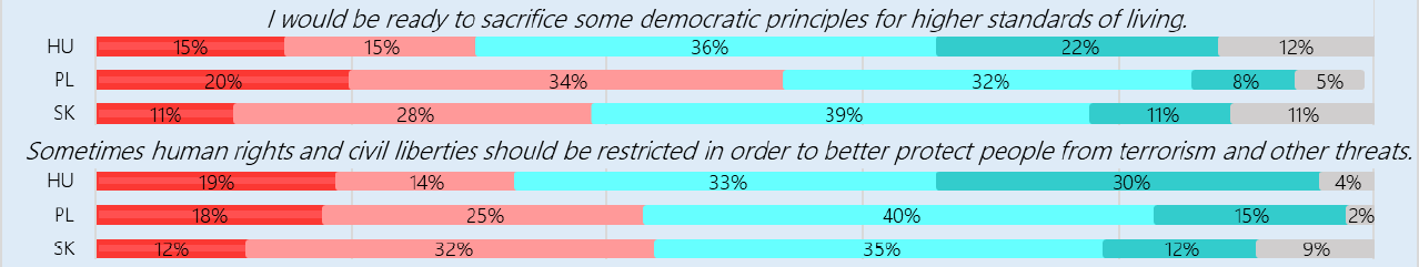 A demokratikus berendezkedés támogatottsága egyöntetű a fiatalok körében, de bizonyos körülmények között hajlandók a demokratikus alapjogokból feladni. Jövedelmi előrelépés érdekében például a magyar fiatalok 58%-a, a szlovákok 50%-a, a lengyelek 40%-a adna fel valamennyit a demokratikus értékekből.