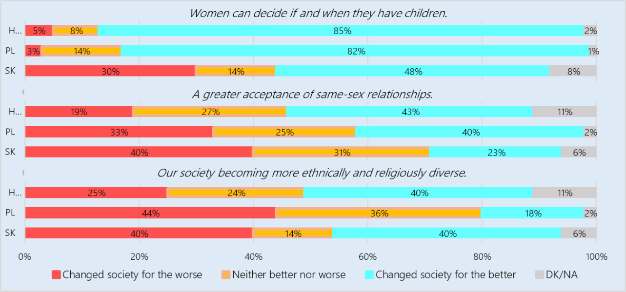 Bizonyos liberális értékek azonban továbbra is fontosnak bizonyultak. A demokrácia feltételes támogatottsága nem jelenik meg olyan témák esetén, amelyek nincsenek az aktuális politikai kommunikáció kereszttüzében. Magyarországon a fiatalok 85%-a tartja egyértelműen jónak, hogy a nők dönthetnek arról, akarnak-e (és mikor) gyereket. Az azonos neműek elfogadása is inkább pozitív, mint negatív (kivéve Szlovákiát).