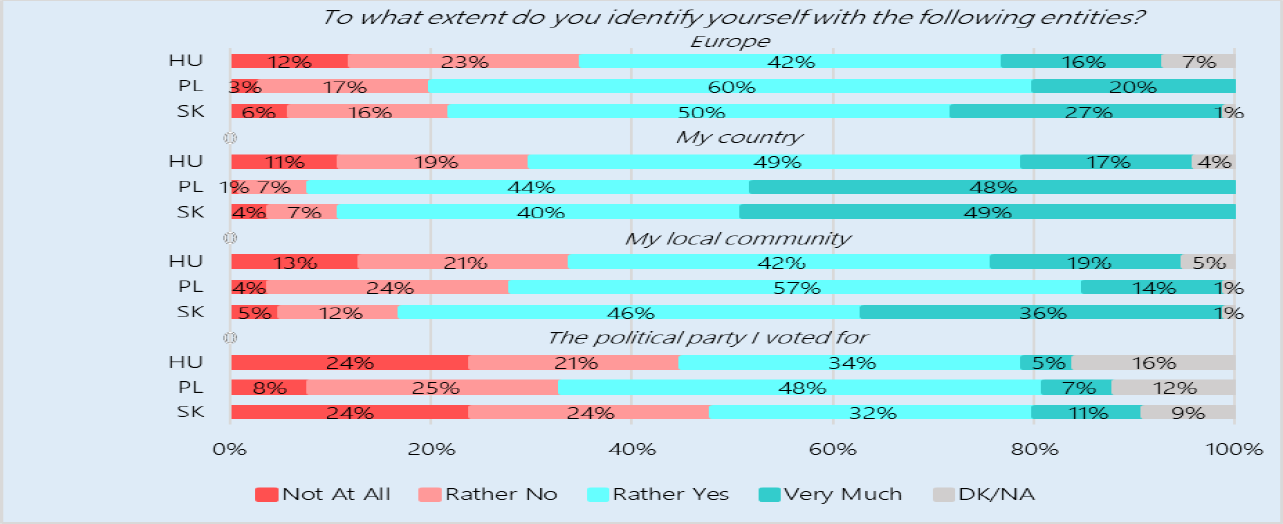 Mindeközben az Európához tartozás fontos részét képezi a fiatalok identitásának. A magyar fiatalok 58%-a vallotta az európait identitása részének, a szlovák és a lengyel fiatalok esetén ezek az értékek 77% és 80%. A nemzeti és az európai identitás együttesen van jelen a fiatalok önképében. Az erős európéer identitás mellett sokan megfogalmazták a fókuszcsoportok során, hogy másodrendűnek érzik magukat az EU-n belül, illetve a magyar fiatalok 41%-a tekint az Európai Unióra a nemzeti szuverenitásra leselkedő veszélyként. A lengyel és szlovák fiatalok 29%-a vélekedik hasonlóan.