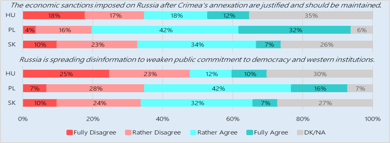 Az oroszokról alkotott kép vegyes, de egyértelműen Magyarországon a legpozitívabb. Az orosz dezinformáció kapcsán nagy a bizonytalanság, a fiatalok 7-30%-a egyáltalán nem is tud róla. A magyar fiatalok csupán 22%-a gondolja, hogy az orosz dezinformáció ártalmas a demokratikus berendezkedésre. Ugyanez az arány a szlovákok és a lengyelek esetén 39% és 58%.