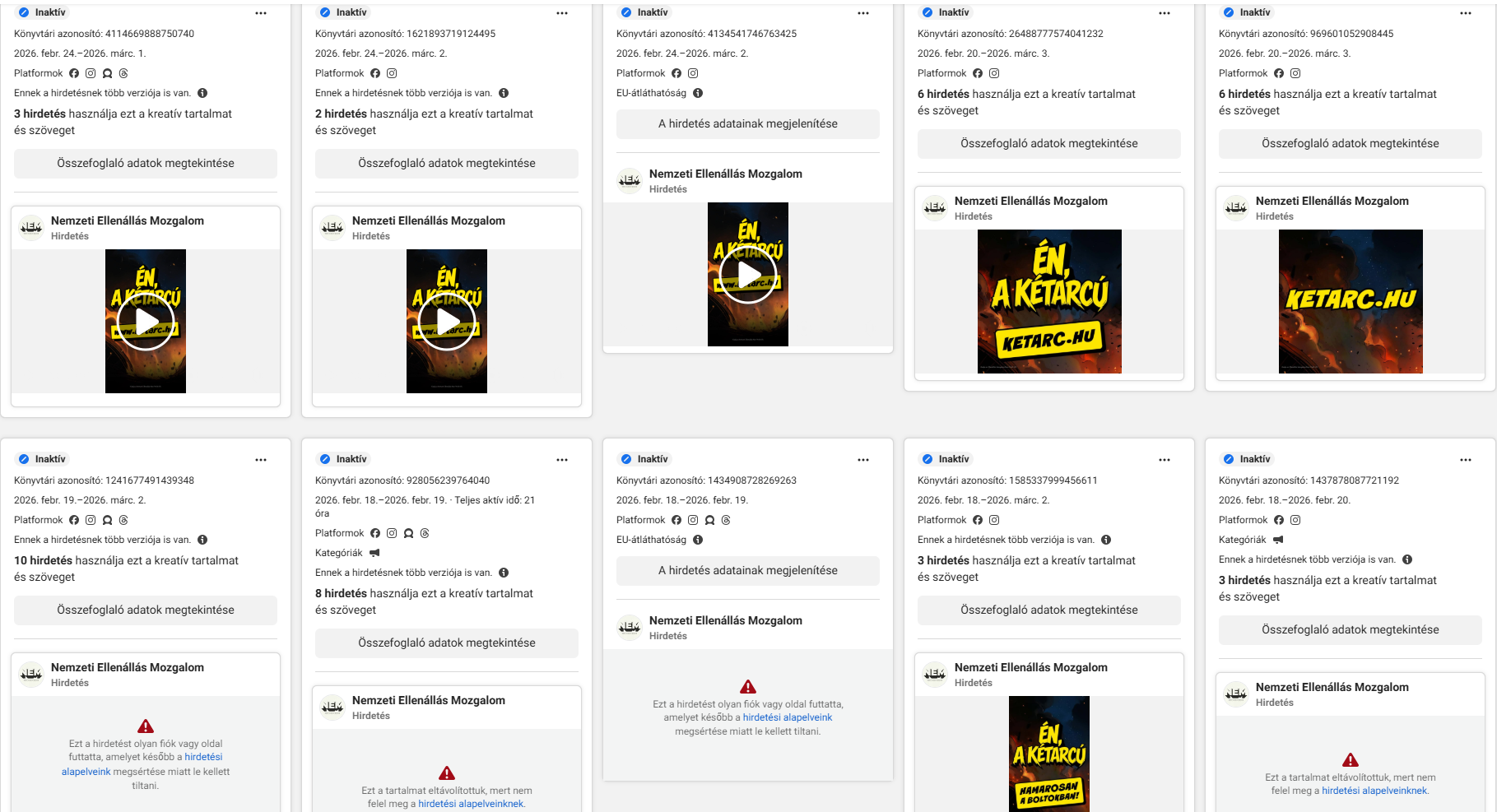 Csak a Nemzeti Ellenállás Mozgalom 183 politikai tartalmú hirdetést indított sikeresen a Meta felületein. Ezek nagy többségét a Meta csak fáziskéséssel állította le, így sok százezer felhasználóhoz utat találtak. A Fidesz kampányát segítő proxyszervezet tudatosan törekszik a Meta politikai szűrőjének kijátszására, és alkalmazkodik a platform reakcióihoz.