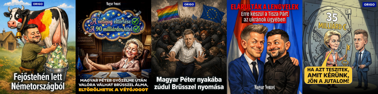 A nemzetközi szereplők és Magyar Péter összefonódása: Több olyan kép épült arra a narratívára, hogy a TISZA elnöke eladja az országot az uniónak. Az Origón megjelent AI-képeken Von der Leyen átadja az uniós pénzek széfének kulcsát Magyar Péternek, a Magyar Nemzetnél pedig a kinevezett miniszterelnök és a bizottság elnöke együtt szalutálnak egy bekeretezett Zelenszkij portré előtt, míg egy másik képen Radoslaw Sikorski nyilatkozatára reagálva Magyar Péter és Zelenszkij összeölelkezve kacsintanak egymás szemébe. Emellett bemutatták, ahogy Von der Leyen asztalra tett lábakkal álmodozik a vétójog eltörléséről és a 90 milliárdos ukrán hitelről, valamint ahogy Marta Kos uniós biztos az új magyar kormánynak örülve ad új lökést az ukrán csatlakozásnak. Zelenszkij démonizálása is folytatódott: hol ordítozva követel pénzt, hol egy aranyvécé és aranyrögök előtt áll a korrupció szimbólumaként, hol pedig egy német zászló színű tehenet fejve pénzt sajtol ki. De előkerült Friedrich Merz is, aki katonaruhában, ukrán zászlóval a háttérben akarja a háború folytatását, illetve Von der Leyen, akire egy szekrénnyi fegyver borul rá korábbi miniszteri botrányaira utalva. Továbbá olyan kép is megjelent, amelyen brüsszeli sötét alakok uniós és LMBTQ zászlókkal törnek rá az új miniszterelnökre az elvárásaikkal.