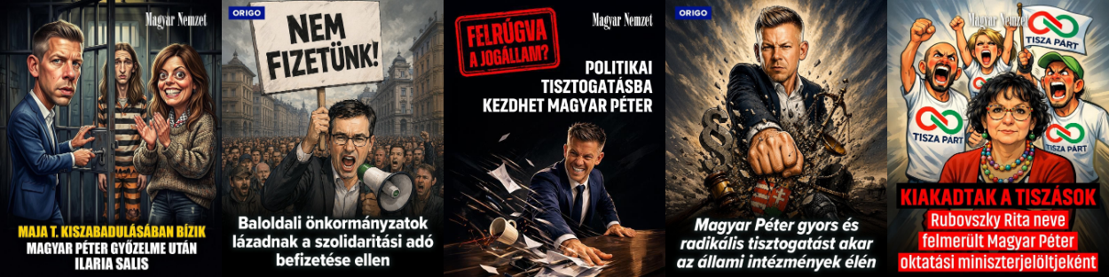 Belföldi „tisztogatás” és politikai káosz: Erősödött a belföldi bosszúhadjárat vizualizálása. A Magyar Nemzet olyan képet közölt, amin Magyar Péter lesöpri a jogállamiságot jelképező tárgyakat az asztalról, az Origo pedig olyan grafikát publikált, amin a pártelnök összetöri a jogállamiság szimbólumait , a „tisztogatásra” és a közmédia állítólagos lekapcsolására utalva. A káosz narratíváját erősítették a Rubovszky Rita miniszterjelöltsége ellen kiakadó és őrjöngő tiszásokat bemutató, valamint a szolidaritási hozzájárulás ellen tüntető Karácsony Gergelyt ábrázoló képek is. Továbbá igyekeztek a szakértelmet is aláásni: az Origón bemutatták, ahogy Kapitány István beismeri, hogy nem ért ahhoz a területhez, amivel megbízták. Emellett bedobták az Antifa-szálat is: AI-képen ábrázolta a Magyar Nemzet, ahogy Magyar Péter kiszabadítja a cellából a Hammerbande tagját, Maja T-t Ilaria Salis társaságában.