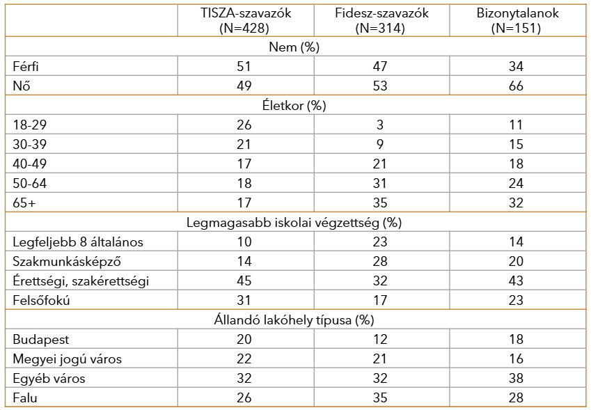 A bizonytalanok csoportjába értjük azokat a válaszadókat, akik vagy nem tudják, vagy eltitkolják, hogy melyik pártra szavaznának, nem tartoznak azonban ide a politikától teljesen elfordulók, akik a pártpreferencia kérdés során is megerősítették, hogy biztosan nem szavaznának. A bizonytalanok demográfiai mintázata, ahogy az alábbi táblázatból is kiolvasható, közelebb áll a Fidesz szavazóinak összetételéhez, mint a TISZA szavazói körében kapott mintázathoz.