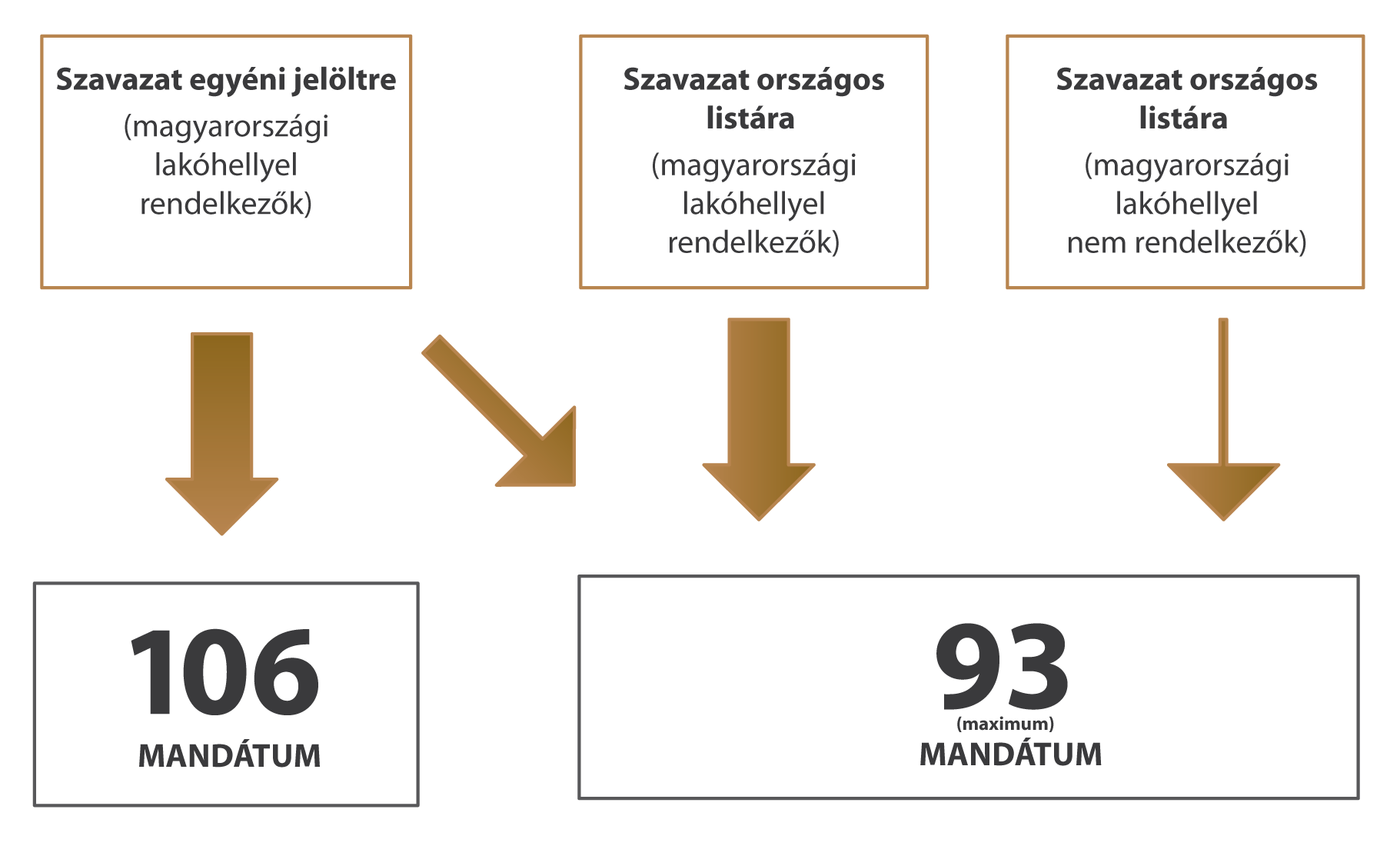 Ahogy az alábbi ábrán is látszik, a listás mandátumokká alakuló szavazatok három forrásból származnak (a nyilak vastagsága érzékelteti a szavazatok nagyságrendjét):