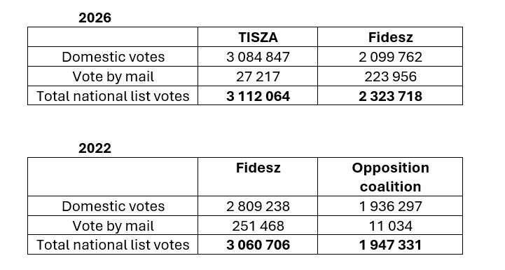 A record was also set for votes cast for the national list: at least 3.1 million people voted for TISZA, a figure which could increase by a further 100,000–200,000. Of the 3.1 million voters, only 20,000 were out-of-country Hungarians who vote by mail. Fidesz's domestic support is expected to total around 2.2–2.3 million votes, which is only around 300,000 more than the six-party opposition coalition received in 2022. Fidesz's best-ever performance was in 2022, when it received 3.06 million votes, 2.8 million of which were cast domestically.