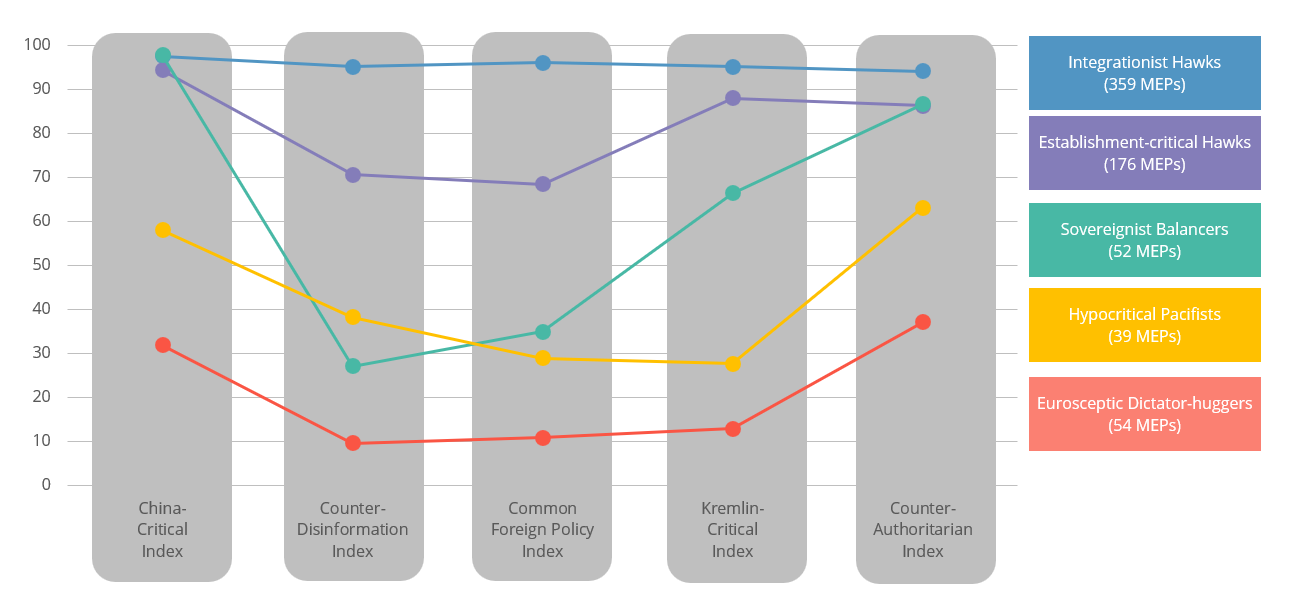 As Figure 1 below shows, MEPs can be divided into five groups based on their scores on the five indexes. The largest group is that of Integrationist Hawks, who make up 53% of the 680 representatives who cast at least the minimum number of votes required. They do not only support joint action against almost all authoritarian regimes, but back the development of common EU strategies in the fields of disinformation and foreign policy. Establishment-critical Hawks – mainly from the European Conservatives and Reformists and the Greens (26%) – would also be in favor of strong action against authoritarian states, but they often express concerns about joint disinformation and foreign policy strategies. Besides the Polish ruling PiS party, several other Central and Eastern European governing forces belong in this group, such as ANO 2011 and Fidesz. Sovereignist Balancers are a much smaller group (8%) than the previous two, including members such as the Italian Lega. They almost completely refuse common EU action against disinformation or joint foreign policy strategies, but are critical of numerous authoritarian regimes, although much less so in the case of Russia, unlike the previous two groups. Hypocritical Pacifists (6%), such as the Austrian FPÖ or the Greek Syriza, do criticize China or other authoritarian states on a case-by-case basis, but are only critical of the Kremlin rarely, while Eurosceptic Dictator-huggers (8%) are unlikely to support any EU action. The latter group is represented, among others, by MEPs from the German AfD and the French National Rally.