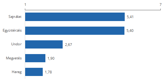 A hajléktalanok helyzete, problémái kapcsán a budapestiekben felmerülő érzelmek (átlagok az 1-7 skálán; minél nagyobb az érték, annál jobban jellemző az egyénre az adott érzelem, amikor a hajléktalanok helyzetére gondol)