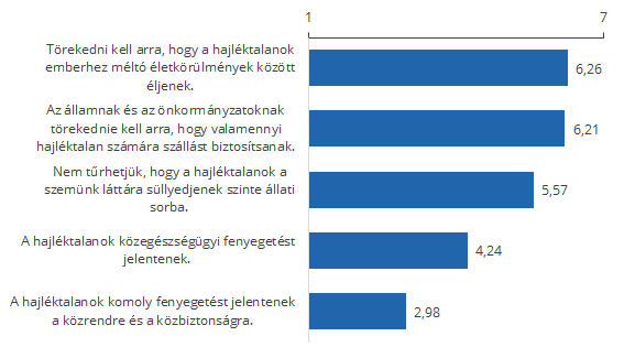 Hajléktalanokkal kapcsolatos állításokkal való egyetértés (átlagok az 1-7 skálán, ahol a nagyobb érték erősebb egyetértést jelent)