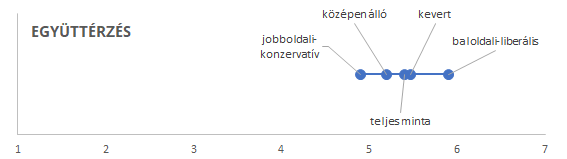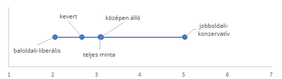 Kutatásunk résztvevőit arra is megkértük, hogy helyezzék el magukat a baloldali-jobboldali, illetve a liberális-konzervatív skálán. A válaszok alapján négy jól behatárolható csoport jött létre. A megkérdezettek 27 százaléka a baloldali-liberális csoportba került. Ők azok, akik mindkét hétfokú skálán (1: baloldali - 7: jobboldali és 1: liberális – 7: konzervatív) az 1-3 értékek valamelyikét jelölték meg. A jobboldali-konzervatív csoportba került a megkérdezettek 20 százaléka (ők mindkét skálán a 5-7 értékek valamelyikét jelölték meg). A középen állók 27 százalékot tesznek ki (ők a 4-es választ jelölték meg mindkét kérdésnél). A fennmaradó 26 százalék vegyesen jelölt a két skálán, ennek a csoportnak a kevert elnevezést adtuk.