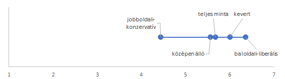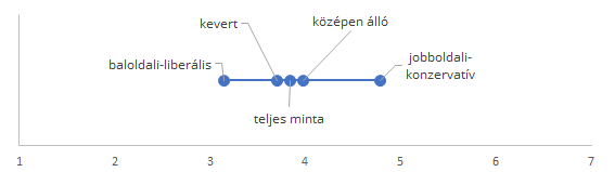 Az alaptörvény-módosítás hatékonyságával kapcsolatos kritika a politikai-ideológiai csoportokban (A Mennyire ért egyet azzal az állítással, hogy az alaptörvény-módosítás valójában csak elrejti, nem pedig megoldja a hajléktalanság problémáját? kérdésre adott válaszok átlaga az 1-7 skálán, ahol a nagyobb érték nagyobb egyetértést jelent)