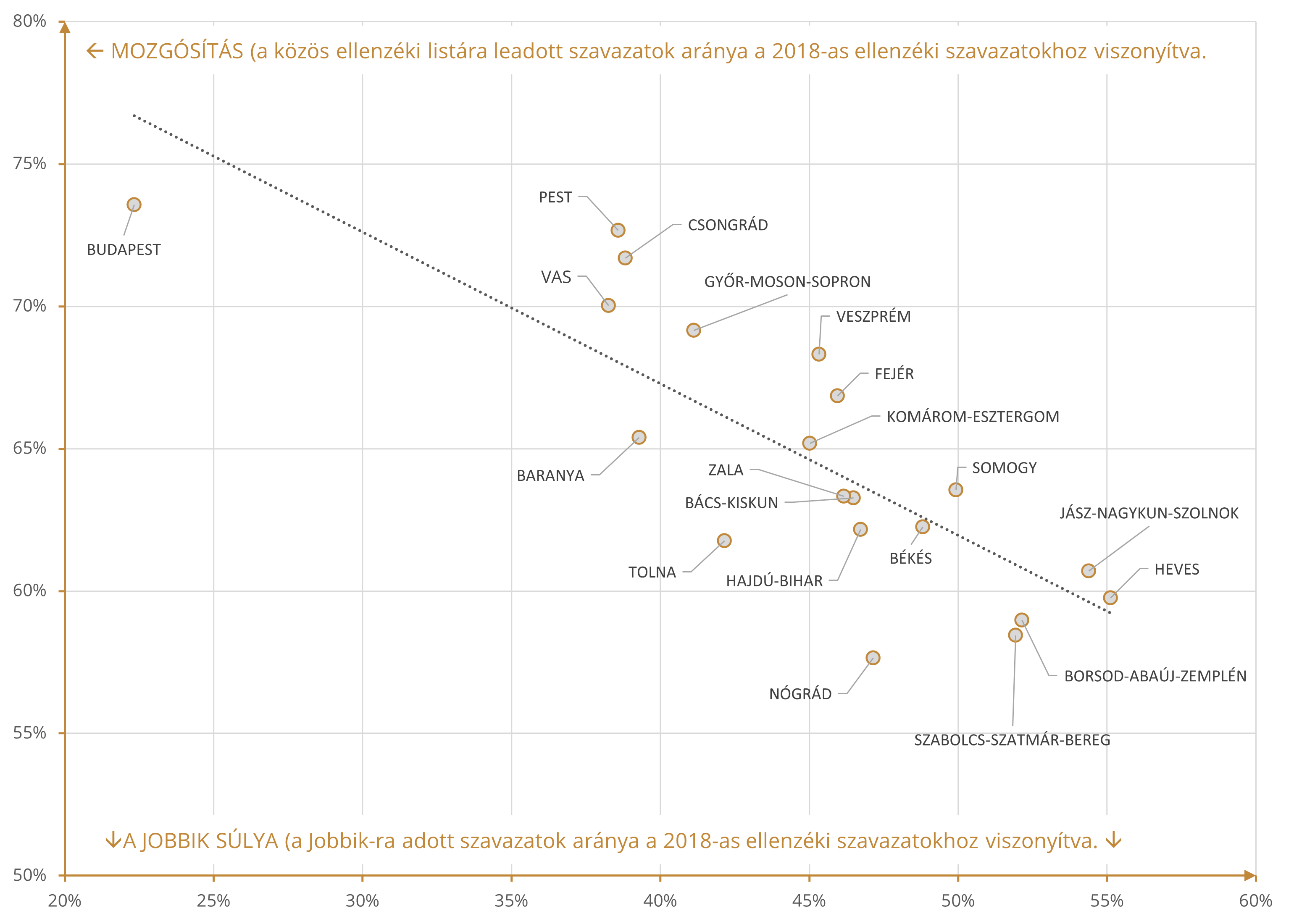 Ez még önmagában nem volna bizonyító erejű, éppen ezért megyei bontásban megnéztük, hogy a 2018-as összellenzéki szavazattömegben mekkora volt a Jobbik (illetve a többi párt) részaránya. Az alábbi ábrán látható, hogy ahogy nő a Jobbik 2018-as súlya, úgy romlik a 2022-es összellenzéki mozgósítás (a korreláció a két érték között -0,81). Tehát azokban a megyékben sikerült kevésbé a mozgósítás, ahol négy évvel ezelőtt magas volt a Jobbik szavazóinak részaránya (a másik három nagyobb párt esetében a kapcsolat előjele ellentétes, azaz az MSZP-Párbeszéd, a DK és az LMP erősebb megyéiben jellemzően eredményesebb volt idén a mozgósítás).