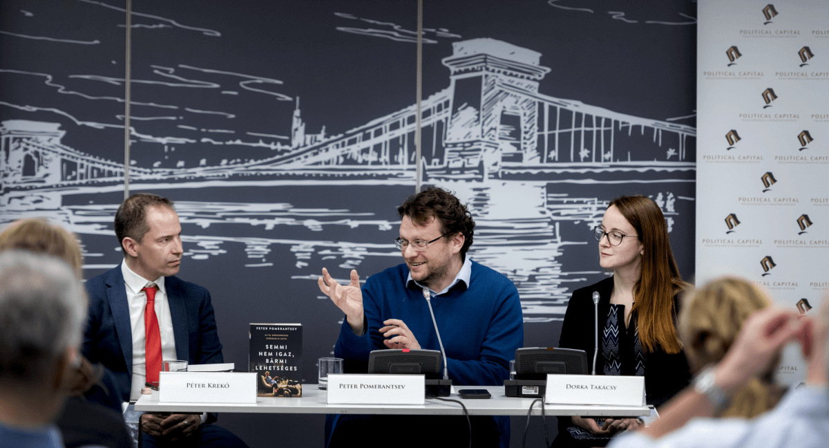 A Political Capital és a Brit Nagykövetség Orosz dezinformáció és Putyin „posztmodern diktatúrája” című konferenciáján vendégül láttuk Peter Pomerantsev brit újságírót, a London School of Economics kutatóját, a nemrégen magyarul is megjelent „Semmi sem igaz, bármi lehetséges”, illetve a „This is not propaganda” című könyvek szerzőjét. A pódiumbeszélgetést Krekó Péter, a Political Capital ügyvezető igazgatója, és Takácsy Dorka, a Political Capital elemzője moderálta.