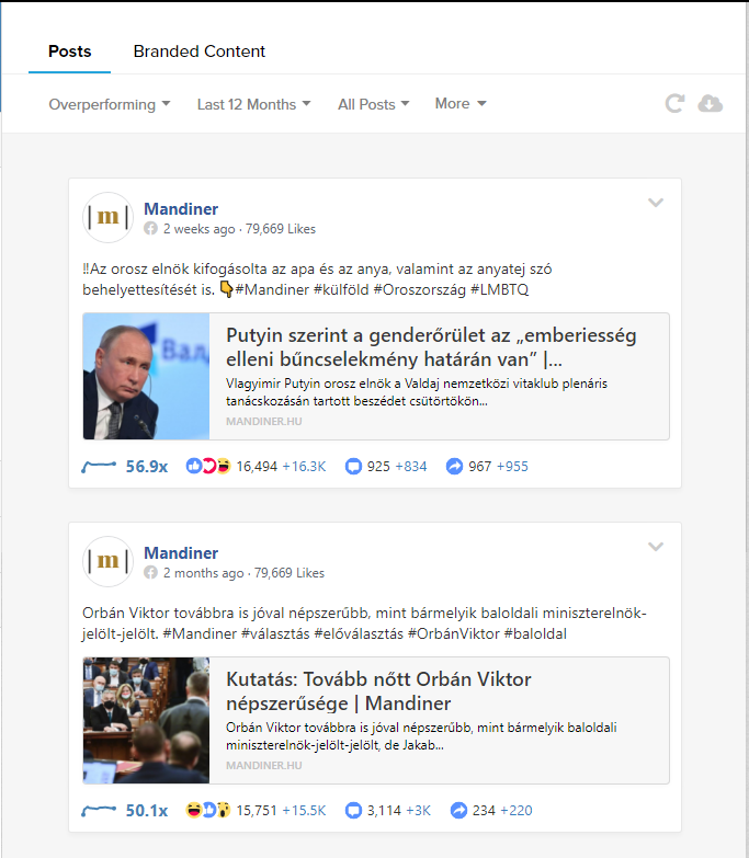 Ennek eredményeképp várható, hogy az „LMBTQ-kérdés” adott esetben fokozottabb reakciókat, több interakciót vált ki a magyar Facebook felhasználókból. Azt ezzel együtt is némi meglepetéssel tapasztaltuk, hogy a Mandiner Facebook-oldalán például óriásit ment egy Vlagyimir Putyin Szocsiban tartott beszédét feldolgozó cikk: a „genderőrületet” emberiesség elleni bűncselekményekhez hasonlító szónoklat több mint 16 ezer kedvelést produkált, a hozzászólások, illetve a megosztások száma pedig megközelítette az ezret. A Crowdtangle adatai szerint a Mandiner átlagos reakciószámának ez közel ötvenhétszerese. Bár az orosz elnök viszonylagos magyarországi népszerűsége dobhatott az elérésen, ez a poszt a Putyint említő Mandiner-bejegyzések átlagát is bőven felülmúlja, sőt, a Crowdtangle szerint ez volt az oldal leginkább felülteljesítő bejegyzése az elmúlt 12 hónapban.