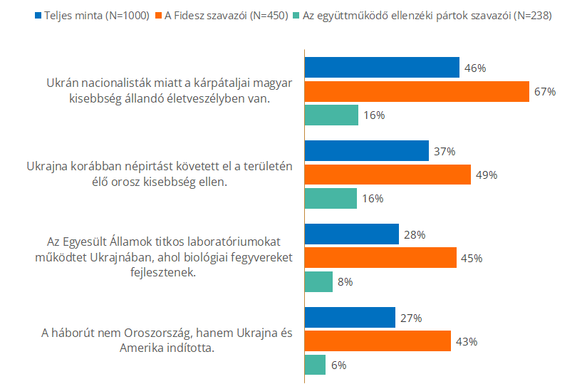 Ezzel összhangban a választók – különösen a kormányoldalon – az Oroszország által is támogatott összeesküvés-elméleteket támogatják. Például, ahogy az 1. ábra mutatja, a magyarok 46%-a ért egyet azzal, hogy az ukrán nacionalisták miatt a kárpátaljai magyarok élete állandó veszélyben van. A magyarok 37%-a szerint Ukrajna ténylegesen népirtást követett el az orosz kisebbségek ellen, és a szavazók 28%-a hiszi, hogy az USA titkos biolabort működtet Ukrajnában, ahol biológiai fegyvereket fejlesztenek az oroszok ellen. A Fidesz-szavazók körében a fenti állításokkal való egyetértés ezekben az esetekben jóval magasabb, mint az országos átlag.