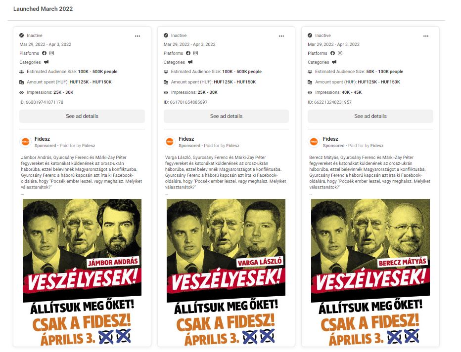 Facebook ads by Fidesz, spreading the same disinformation narrative about different opposition MP-candidates connecting them to PM-candidate Márki-Zay, and former PM Ferenc Gyurcsány; Source: Facebook Ad Library