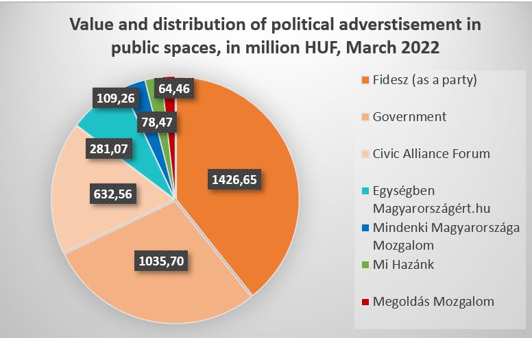 - The Fidesz-organized NGO called the Civic Alliance Forum (CÖF) and the ruling party, supported by the Cabinet Office of the Prime Minister, commissioned advertisements on 12 171 billboards worth more than HUF 3 billion at list price only in March. Together they spent eight times more than the opposition and three time more than the legal limit. Fidesz, as a party, spent about HUF 1.4 billion, the government 1 billion and the CÖF spent more than 630 million, so the ruling party in itself overspent the limit of 1,17 billion for all campaign advertising costs.