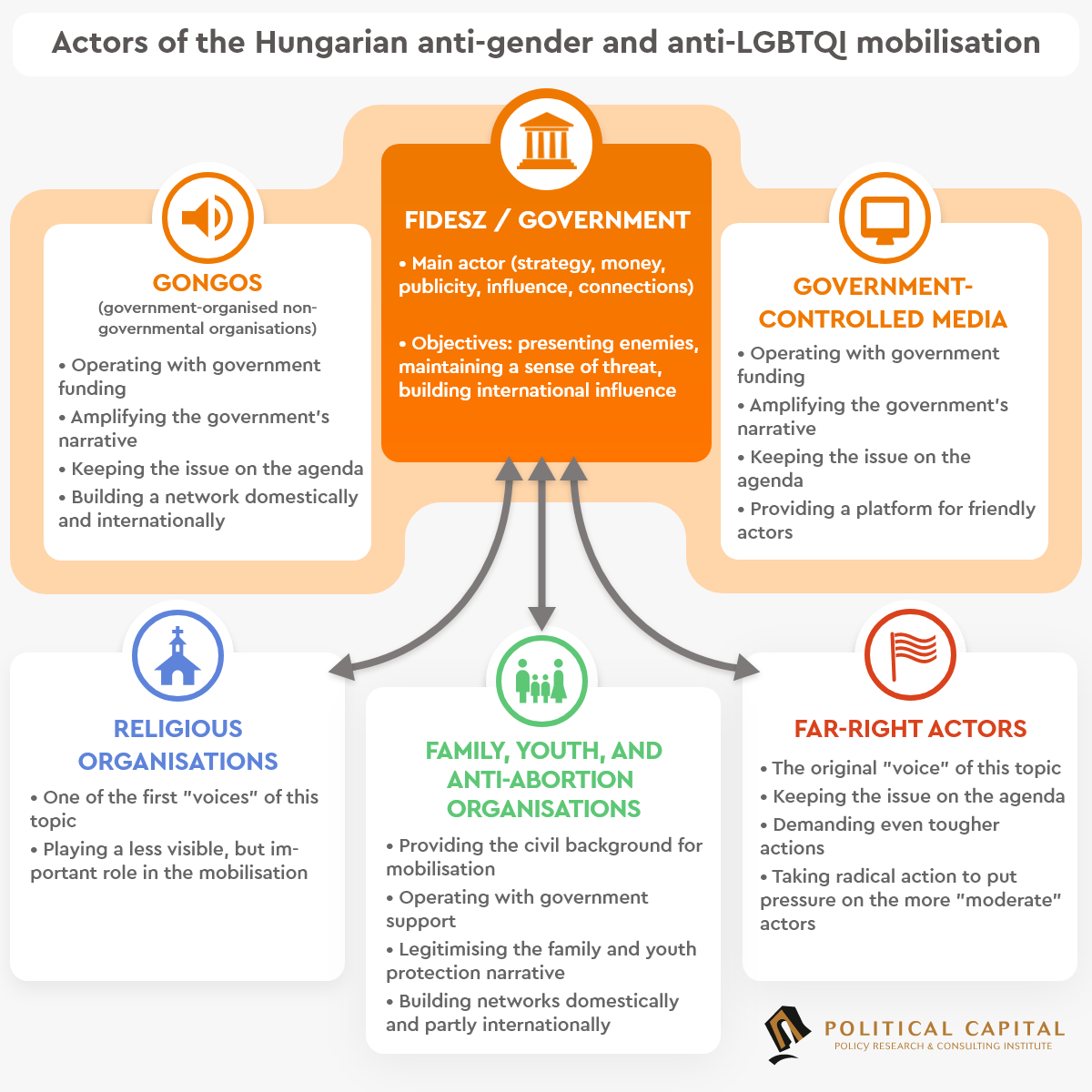 - The Fidesz government and its proxies (government-organised NGOs, think tanks and media, semi-independent family and anti-abortion organisations and far-right groups) have been the main disseminators of anti-gender and anti-LGBTQI narratives.